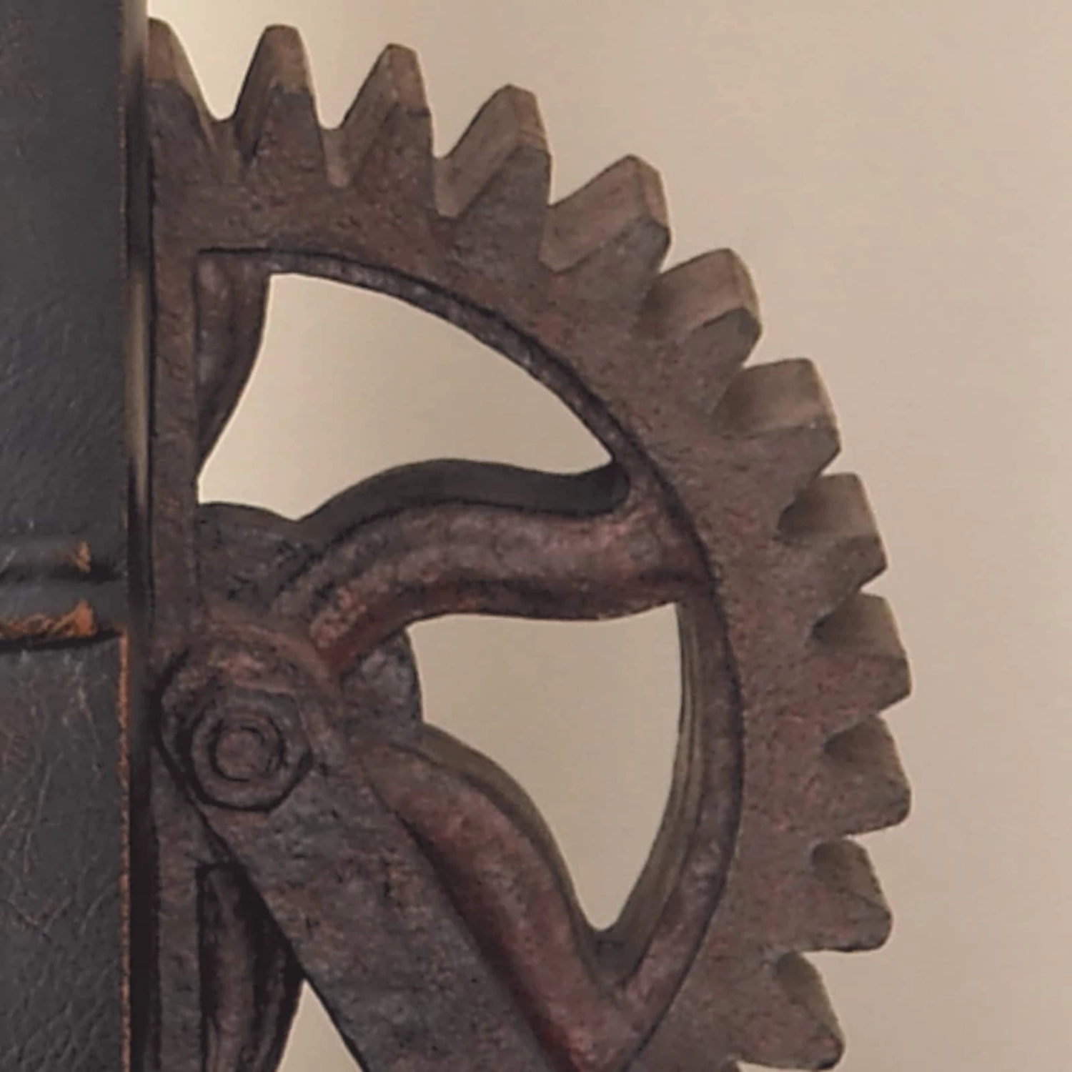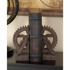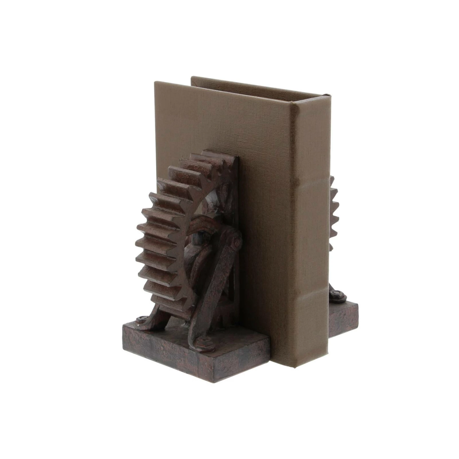 This set of textured dark brown gear bookends features a large round gear sculpture split down the center to place and prop your books up. The polystone construction is durable and has a worn, rock-like finish for a vintage look with an industrial feel from the clunky gear design. Add bold industrial style to your shelves while keeping your books organized and tidy. Designed with black rubber stoppers at the base that prevent scratching furniture and table tops, as well as sliding around.