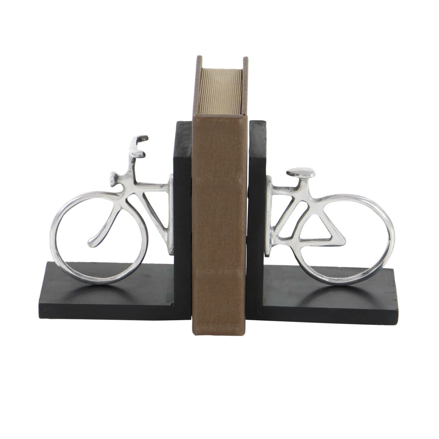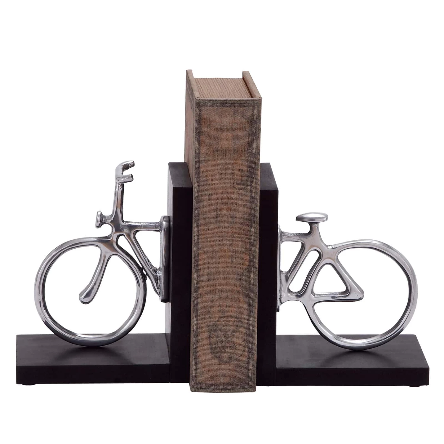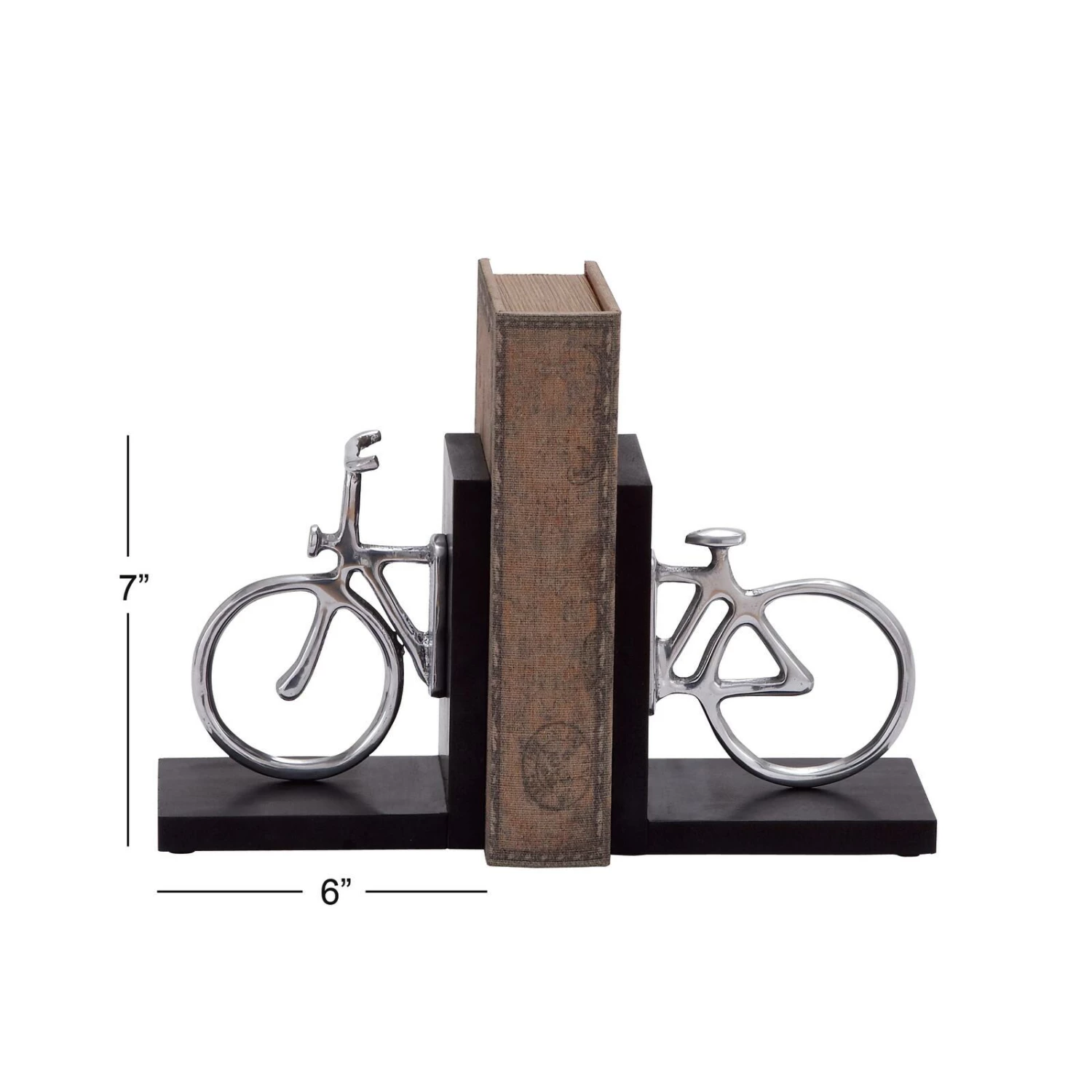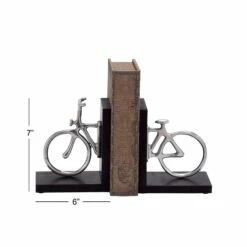 Travel the universes offered by books in no less than this stylish classic wood and aluminum silver bicycle bookend pair. Its clever design is not only visually stimulating but is also made to serve its purpose. The two ends of the bike are mounted on a platform which makes the job of holding steady the shelf of books a stroll in the park. Once set on a shelf, these bookends create an illusion of an elongated bike with the books as its chassis. Designed with black rubber stoppers at the base that prevent scratching furniture and table tops, as well as sliding around.
