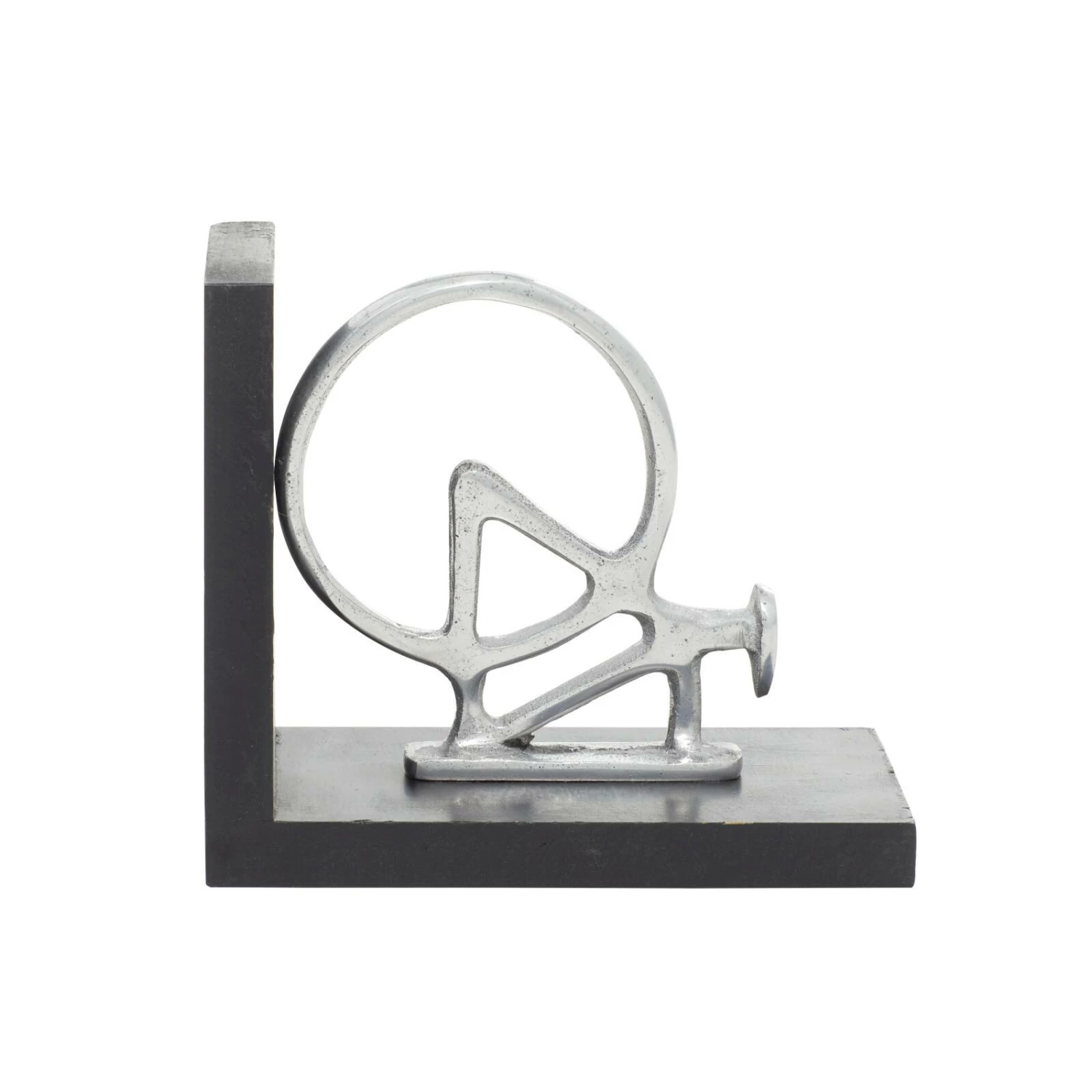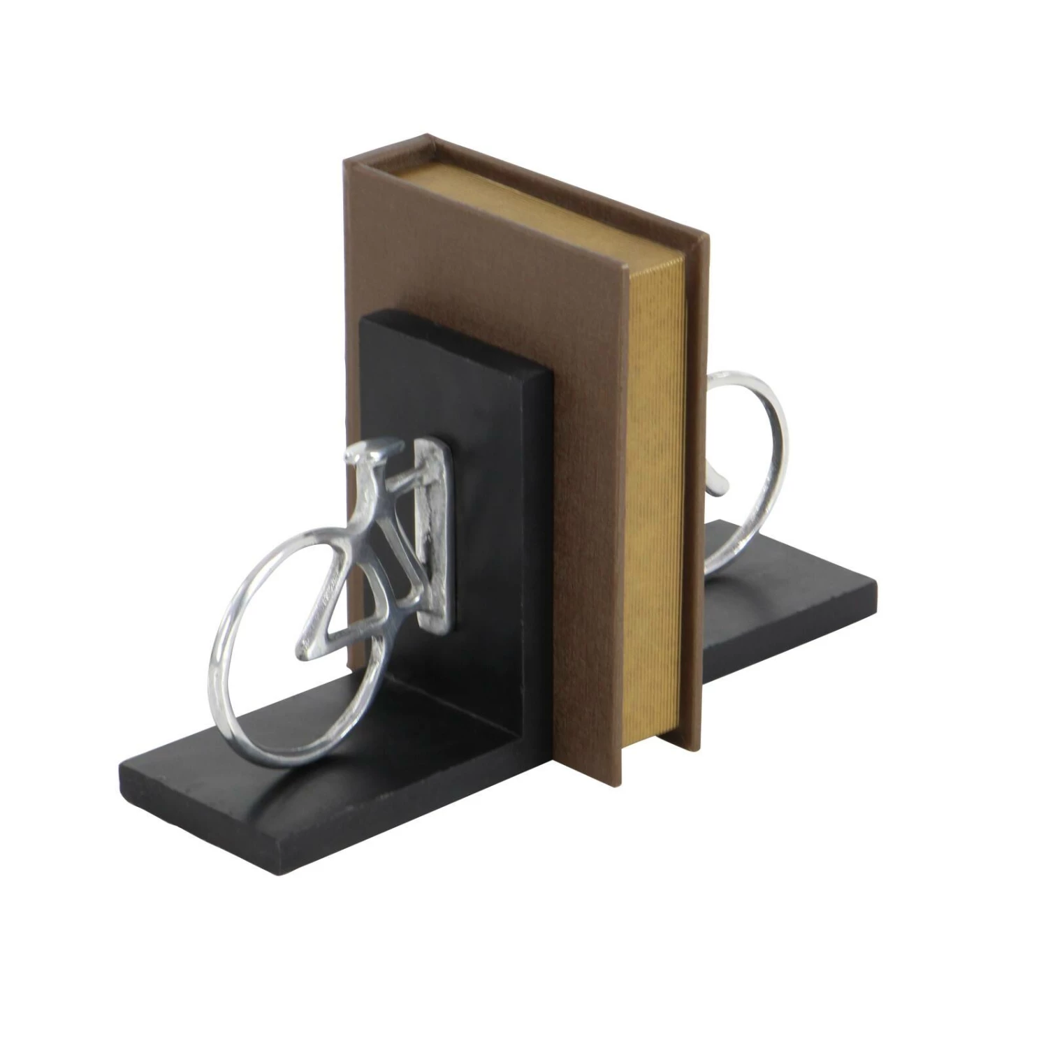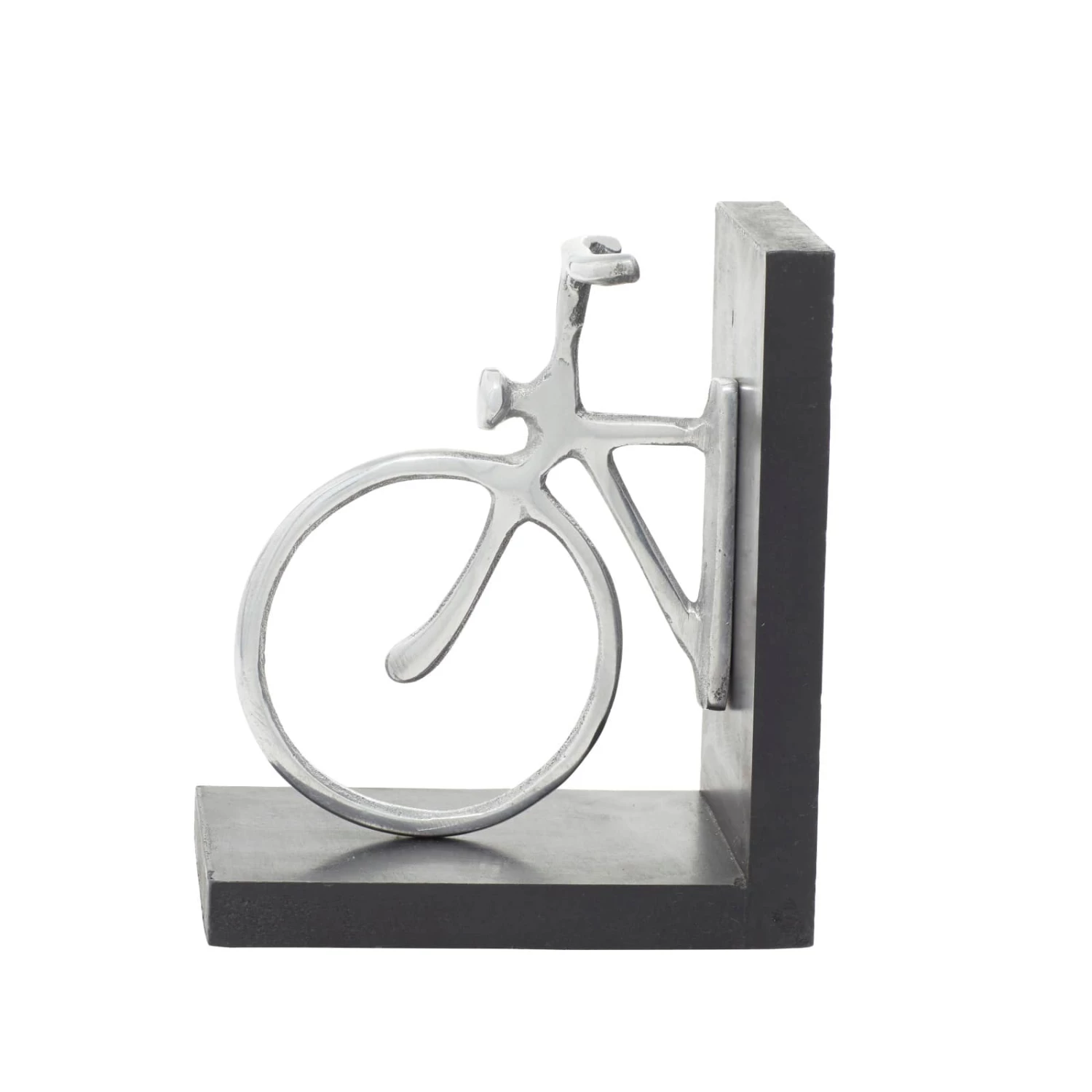 Travel the universes offered by books in no less than this stylish classic wood and aluminum silver bicycle bookend pair. Its clever design is not only visually stimulating but is also made to serve its purpose. The two ends of the bike are mounted on a platform which makes the job of holding steady the shelf of books a stroll in the park. Once set on a shelf, these bookends create an illusion of an elongated bike with the books as its chassis. Designed with black rubber stoppers at the base that prevent scratching furniture and table tops, as well as sliding around.