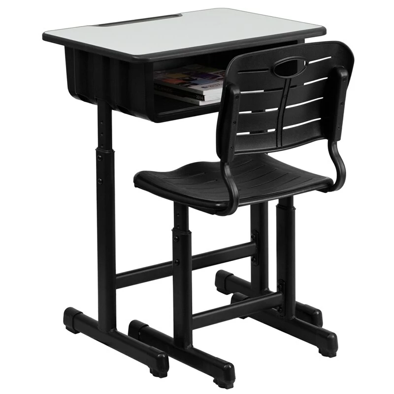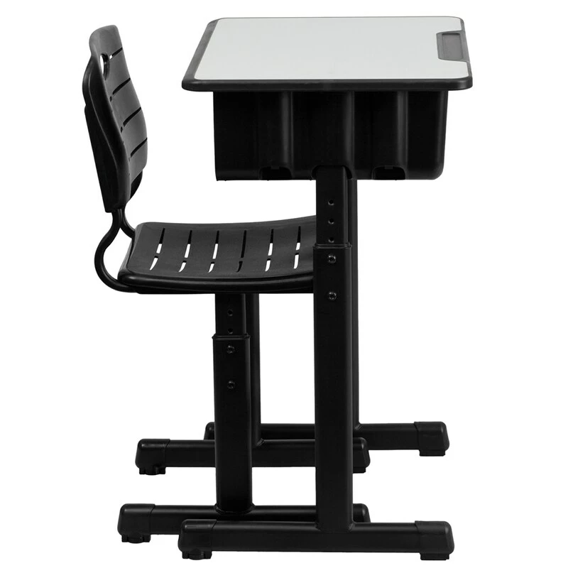The difference of ages and sizes among students in a school even within a classroom may be significant so if you’re responsible for purchasing furniture for schools an adaptable chair and desk set is a must. The Student Desk and Chair with Black Pedestal Frame is a sturdy addition to the classroom that can fit students of all sizes. The desk has a .75 inch thick high pressure laminate top with a convenient pencil groove. The durable black pedestal frame features adjustable height legs to raise it up by 3 inches. Under the desktop is a spacious heavy duty book box with ample room for books papers and supplies as well as hooks on both sides to hang students’ backpacks and jackets. The chair features a pedestal frame that provides added stability and adjustable height legs. The seat and back are constructed of sturdy plastic and the slatted back provides air circulation for greater comfort. Anti slip floor caps on the legs help to prevent the desk from sliding and reduce distracting noises. This student desk and chair set is ideal for classrooms from elementary through high school.Product Dimension 23.625″W x 17.75″D x 28.25″ 31.5″H