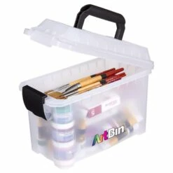 Transport and store supplies safely in this translucent polypropylene plastic storage units. The storage box includes a lift-out tray and multiple compartments for holding brushes, paints, scissors or other essentials. The lockable lid contains additional storage space.