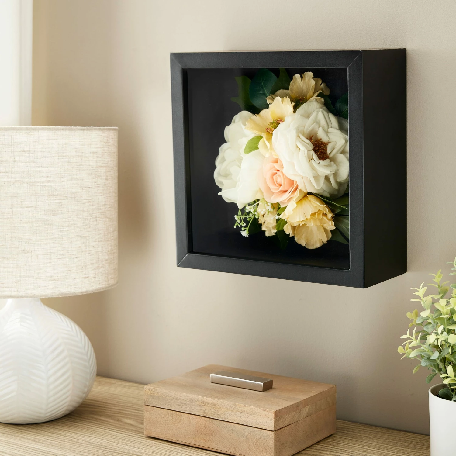 Display your mementos and keepsakes! This shadowbox is extra deep, perfect for storing and displaying some of your larger items, such as a wedding bouquet or a mum. It also features soft velour backing and attached hanging hardware.