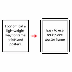 Display your favorite poster, artwork or photograph in this affordable wall frame. It has backboard and hardware for easy hanging on a wall. Shatter-proof, lightweight styrene covers the opening of the frame instead of glass.