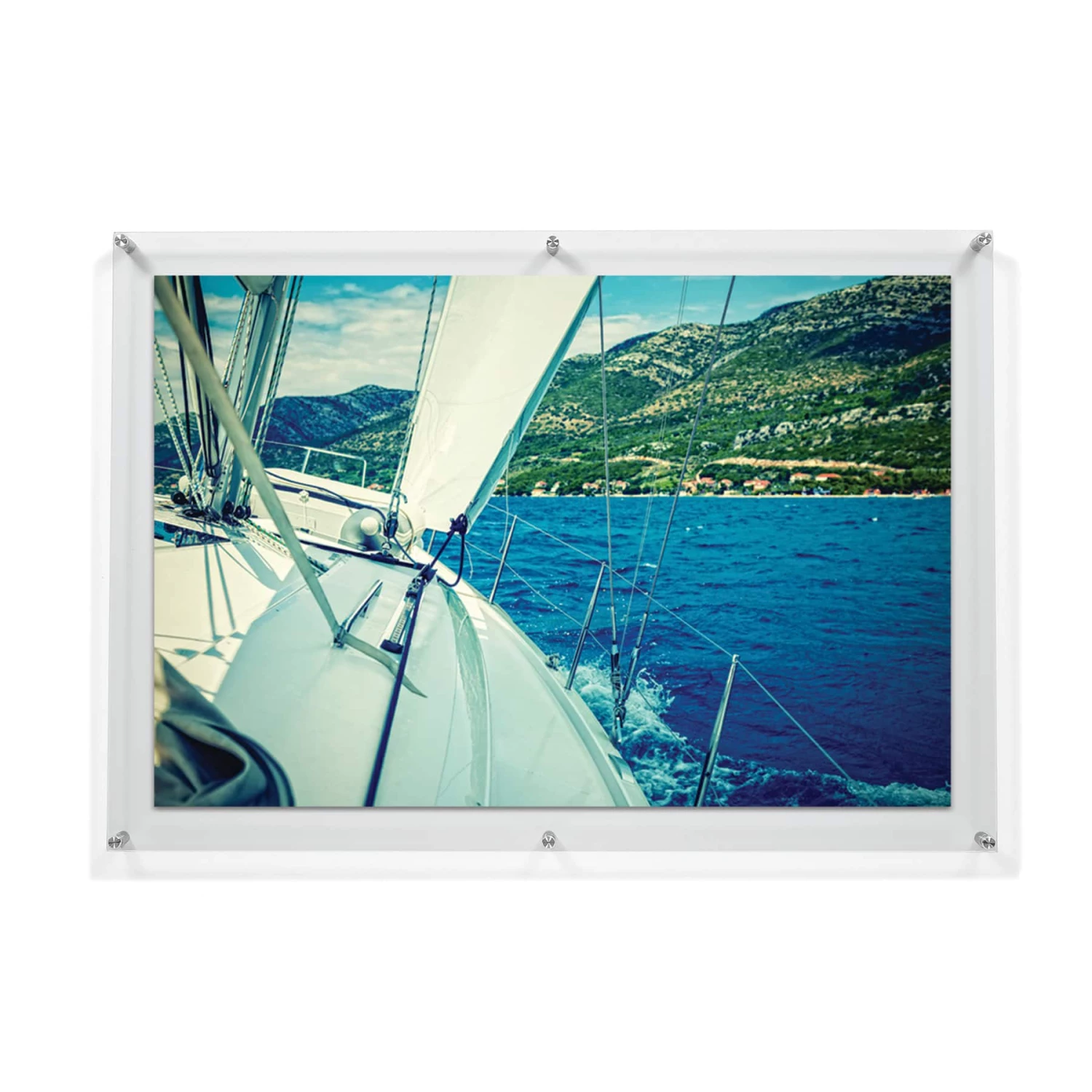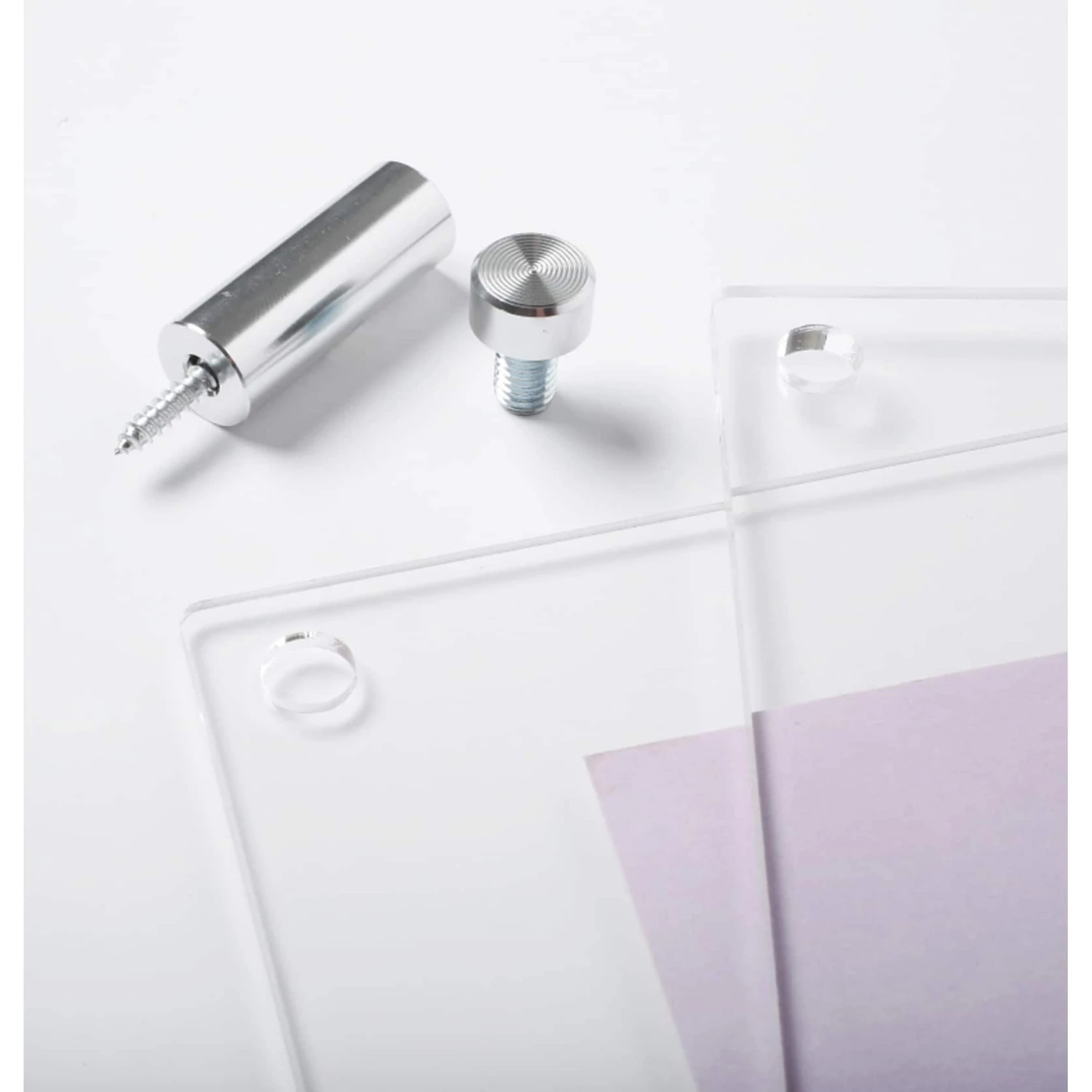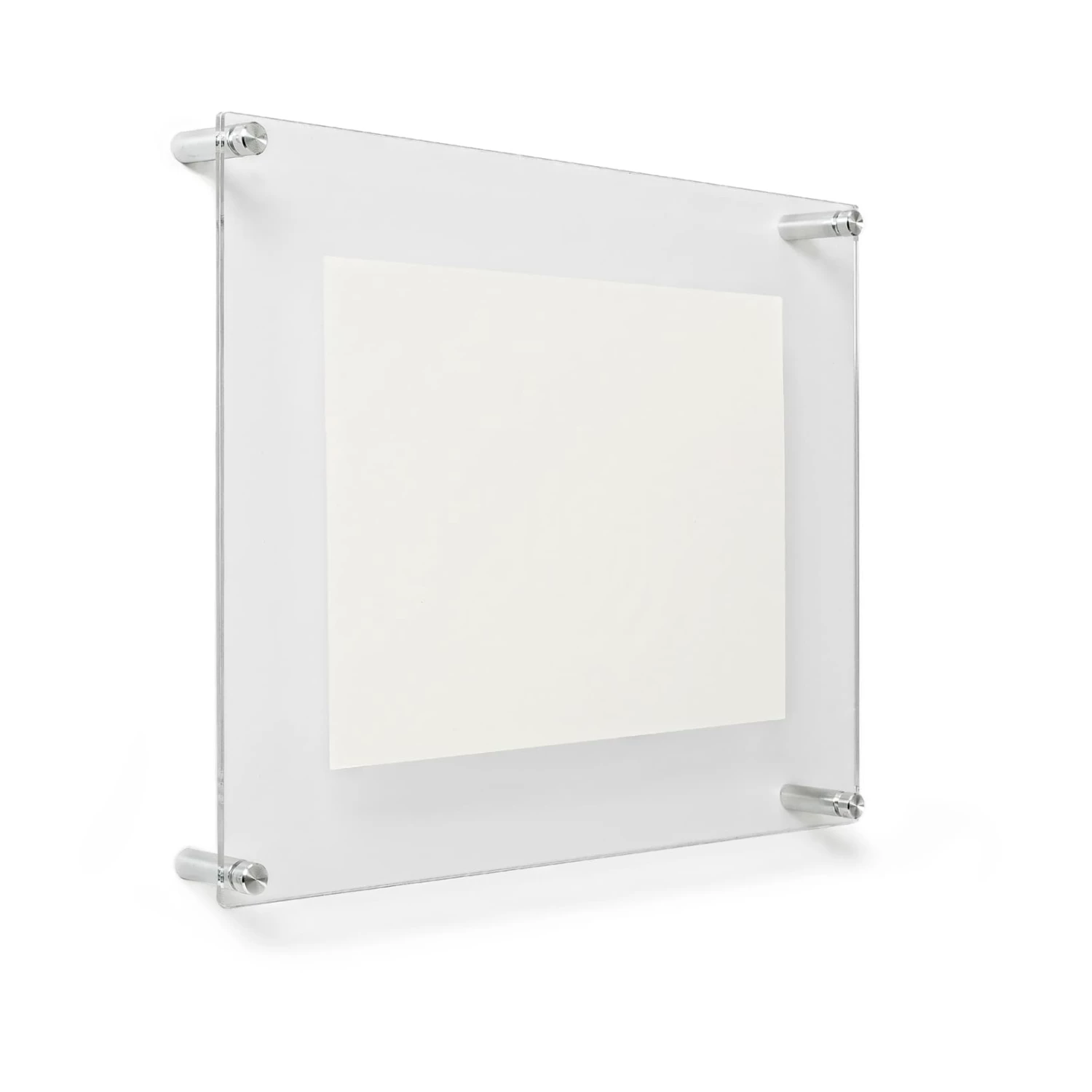 Float your artwork and photos off the wall while fully enclosing your art in between two panels of UV protected acrylic. When you want to change out your display, just unscrew the caps on the hardware and lift off the plexiglass.
